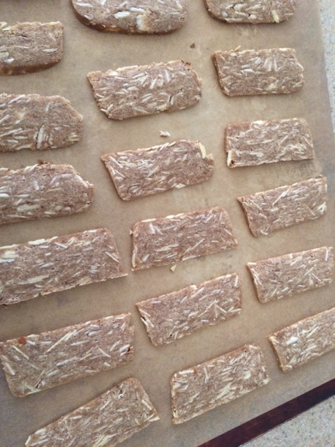 Let cool. Pack into rectangular tin (loaf pan, etc.) lined with plastic wrap. The dough will be like fudge. Freeze or chill until very firm. Unmold on cutting board. With a large, very sharp knife cut slices as thin as possible—1/16th inch—either rectangular or square. (The size of the pieces will depend on the size of your pan, although you could cut them in half.) Bake spaced apart on parchment at 325 for 10 minutes. Then take out of oven and let cool until you can turn them easily with your fingers (without burning yourself or breaking the cookies) and return to the oven to bake for another 10 minutes. A small angled spatula is useful for turning, too.  Let cool—cookies should be very crisp when cool. Packed together like cards in a deck, they are sturdy enough to mail.