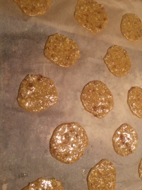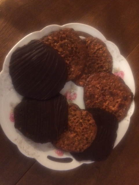 Drop by half teaspoons on parchment and pat with a finger moistened in water to a circle. Cookies will spread to about 2 1/2 inches, so space them generousl Bake at 350 or 360 (if you are impatient) for about 15 minutes or until evenly brown. Cookies will firm upon cooling. Once the cookies are cool, brush the back of each one with a thin layer of tempered bittersweet chocolate (you’ll need about a pound, or maybe more!) I use a silicone brush which is easy to clean. To temper 72% chocolate, melt it to 105 degrees, then let cool to 80 before brushing. This assures a crisp snap and a shiny look. It also helps preserve the cookie.