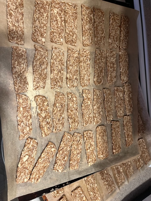 Biscoff cookies offered by the airlines are irresistible: crunchy, sweet, spicy. But the ingredients are terrible: sugar, flour, oil. I set out to make a better cookie with better qualities of flavor and crunch. And due to the almonds, these cookies actually contain fair amount of vitamin B2; sesame seeds contain B6 and minerals. These are a variant of Flo Braker’s Pain d’Amandes, i.e. “crunchiest almond cookies” I posted a year ago, but better. (David Leibowitz has a version, too, with twice the sugar.) Hence, B2. These contain less sugar and more flavor, more protein (from the nuts and sesame seeds).