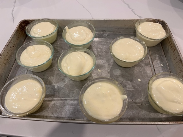 Preheat oven (NOT CONVECT) to bake at 330F and spray 9 custard cups with Baker’s Joy (or grease and flour). Baker’s Joy comes in generic brands as well, often termed “baking spray with flour.” Find a baking pan or two big enough to hold all the cups and deep enough to fill with at least 1 inch of water. (You won’t fill it with water until it’s in the oven.)